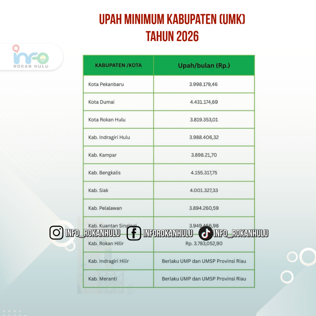 Regulasi tersebut menjadi acuan utama dalam memastikan perlindungan upah pekerja dan menjaga keberlangsungan dunia usaha di daerah. Untuk tingkat provinsi, UMP Riau Tahun 2026 ditetapkan sebesar Rp 3.780.495,85 atau mengalami kenaikan Rp 271.719,63 dibanding tahun sebelumnya.
