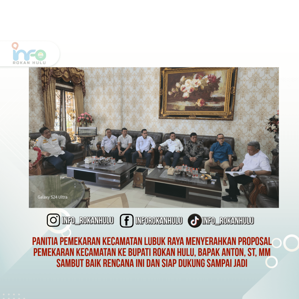 Rabu, 31 Desember 2025 Bupati Rokan Hulu Anton, ST, MM menyambut langsung kedatangan Badan Pemekaran Kecamatan Lubuk Raya di Rumah Dinas Bupati, Proposal pemekaran yang sudah disiapkan langsung diterima oleh Bupati Rokan Hulu.
